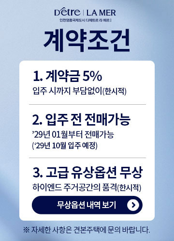 영종국제도시의 푸른 해안선과 맞닿은 입지에 걸맞게, ‘디에트르 라 메르’는 바다의 여유와 도시의 품격이 조화를 이루는 주거 랜드마크로 탄생했습니다.