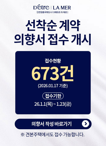 영종국제도시의 푸른 해안선과 맞닿은 입지에 걸맞게, ‘디에트르 라 메르’는 바다의 여유와 도시의 품격이 조화를 이루는 주거 랜드마크로 탄생했습니다.